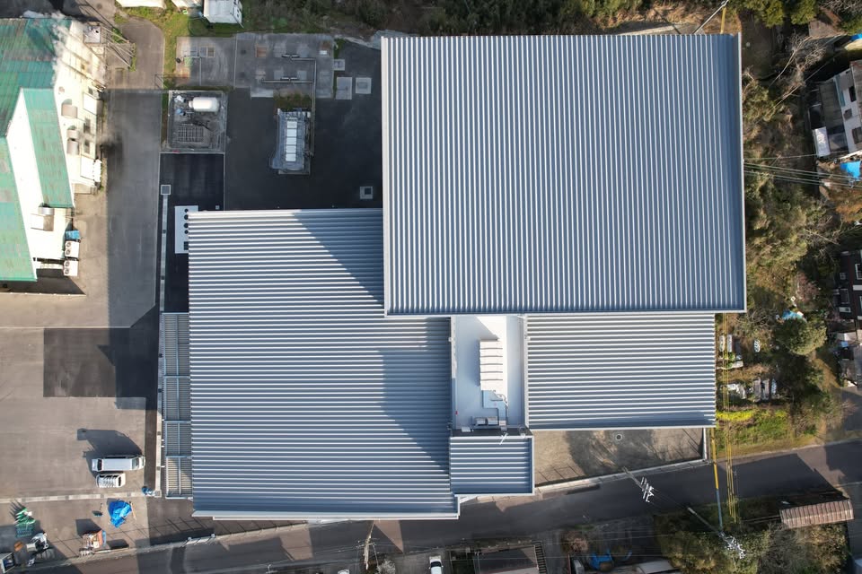 | 作業内容 | 鹿児島県内の工場新築現場にて、屋根・外壁・外装工事一式を担当させていただきました。 屋根にはダブルパック工法を採用し、耐久性と機能性を兼ね備えた仕上がりとなっています。 外壁はサイディングにて施工し、建物の外観をほぼ一式担当しております。 大規模施設の外装を一貫して対応した施工事例です。 |